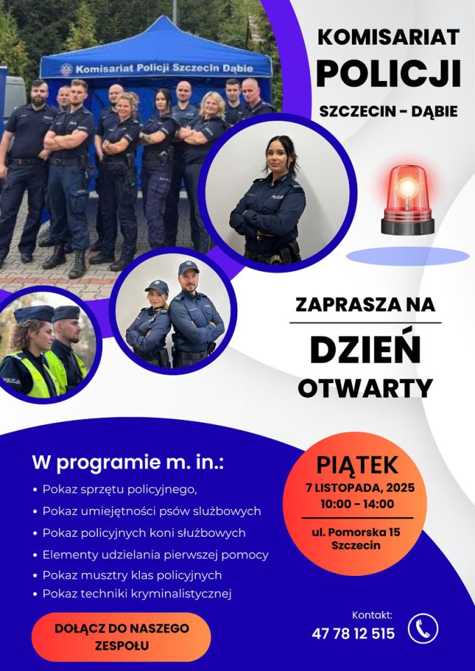 Komisariat Policji Szczecin Dąbie otwiera dziś swoje drzwi dla osób rozważających karierę w Policji. W godzinach od 10:00 do 14:00 goście będą mogli poznać specyfikę pracy funkcjonariuszy oraz zapoznać się z procedurą naboru.