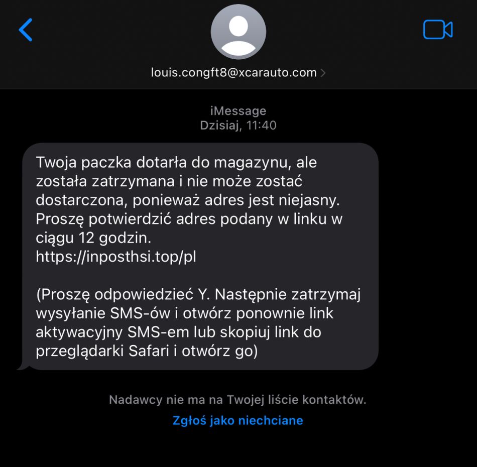Ostrzegamy przed kolejną falą oszustw, w których przestępcy podszywają się pod firmy kurierskie, wysyłając fałszywe wiadomości SMS i iMessage. Przykładem są wiadomości, informujące o rzekomym zatrzymaniu przesyłki z powodu „niejasnego adresu”. Wiadomość nakazuje kliknięcie przesłanego linku w ciągu 12 godzin, pod pretekstem potwierdzenia danych. To klasyczny atak typu „smishing”!