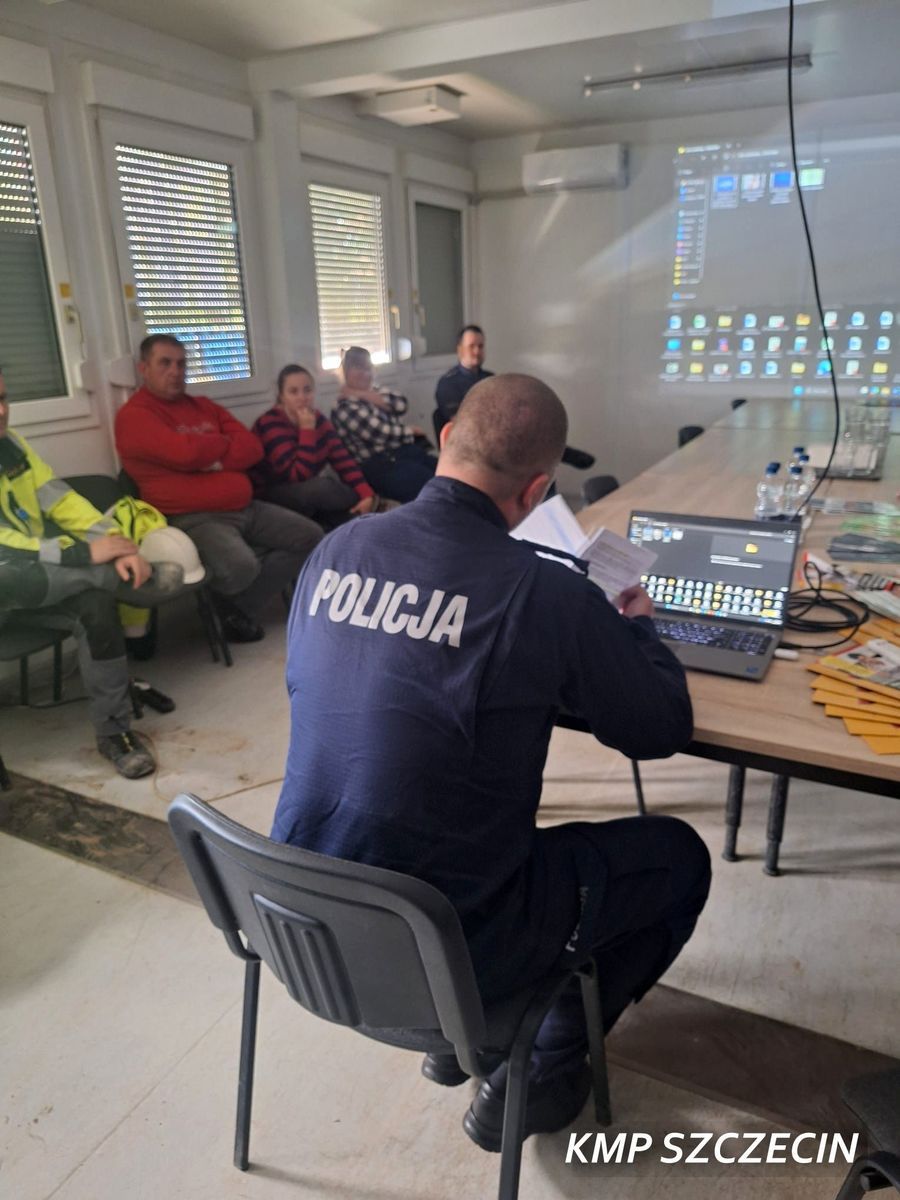 Funkcjonariusze Wydziału Prewencji oraz Ruchu Drogowego Komendy Miejskiej Policji w Szczecinie spotkali się z pracownikami budowy budynku BKDB Pomorskiego Uniwersytetu Medycznego przy ul. Unii Lubelskiej. Spotkanie zostało zorganizowane na zaproszenie specjalisty ds. BHP i poświęcone było szeroko pojętemu bezpieczeństwu w miejscu pracy.