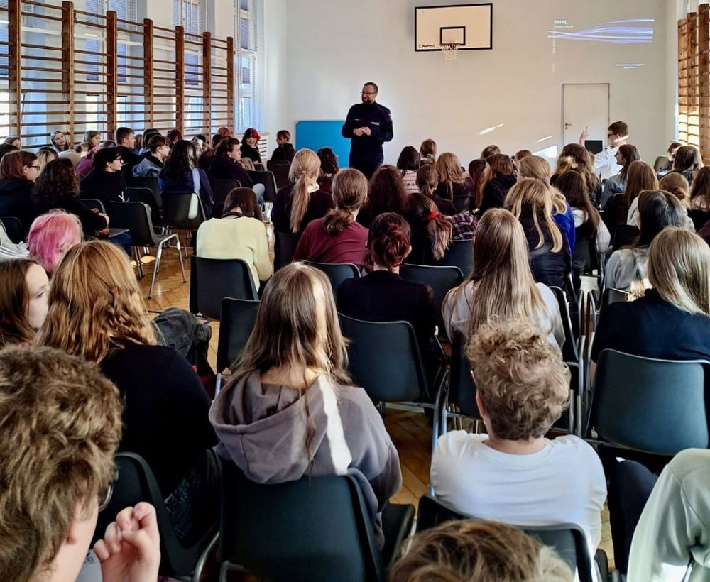 Po wykładzie uczniowie aktywnie zadawali pytania dotyczące omawianych zagadnień. Funkcjonariusz przedstawił także warunki i ścieżkę wstąpienia do Policji, omówił wymagania rekrutacyjne oraz codzienne obowiązki w służbie.