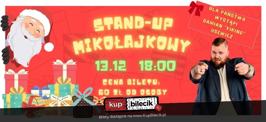 | Damian "Viking" Usewicz Mikołajkowy Stand-Up Comedydodano 2025-11-06 19:13:55 Jedyna taka okazja! W Hotelu Zbyszko wystąpi specjalnie dla Państwa odnoszący sukcesy w świecie stand-uoerów Damian "Viking" Usewicz. Jak wiadomo stand-up jest lepszy od kabaretu. Dlatego zarezerwuj już dziś swój bilet i baw się świetnie! Gorąco polecamy i zapraszamy! Bilety do nabycia na: KupBilecik.plDamian Viking Usewicz Stand-up artyści: Damian Viking UsewiczSzczeciński komik który swoimi żartami nie odpuszcza ani sobie ani swoim bliskim ani nikomu innemu! Na scenie komediowej od ponad 10 lat. W swoich występach nieszablonowo porusza tematy z życia wzięte okraszając je czarnym humorem i mnóstwem dystansu do siebie. Widziany na Ryjku, w Comedy Central a także na platformach WOW i Playerze. Dostał się do finałów PAKI ale tam go nie widziano bo…COVID! W najnowyszym programie "Życie 3.0" opowiada, co sprawia, że jesteśmy tym kim jesteśmy, dlaczego warto być uprzejmym, jak karał go ojciec i czemu nie cierpi Dworca w Gliwicach oraz dlaczego mały pęcherz w dużym ciele to nienajlepszy zestaw. Bilety do nabycia na: KupBilecik.pl |
