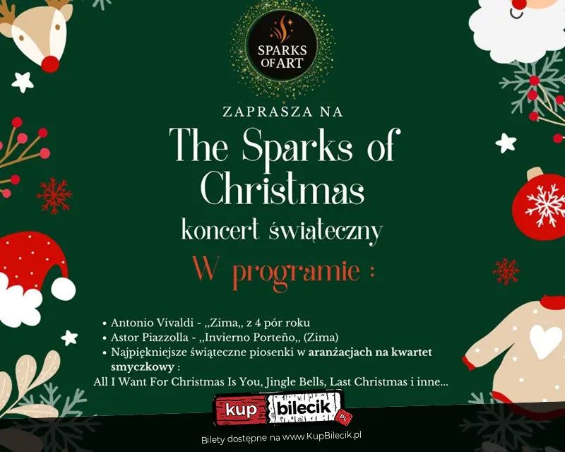 bilety: Poczuj magię Świąt i daj się porwać brzmieniom, które rozświetlą grudniowy czas! "The Sparks of Christmas" to świąteczny koncert kwartetu smyczkowego ,,The Sparks,,, łączący elegancję klasyki z radością najpiękniejszych piosenek świątecznych znanych na całym świecie. The Sparks of Christmas artyści: Różni wykonawcyPoczuj magię Świąt i daj się porwać brzmieniom, które rozświetlą grudniowy czas! "The Sparks of Christmas" to świąteczny koncert kwartetu smyczkowego ,,The Sparks,,, łączący elegancję klasyki z radością najpiękniejszych piosenek świątecznych znanych na całym świecie. W pierwszej części zabrzmią dwa wyjątkowe dzieła - IV część koncertu "Cztery pory roku" Antonio Vivaldiego ("Zima") oraz porywająca "Invierno Porteño" ("Zima") Astora Piazzolli. Druga część koncertu to pełne blasku aranżacje znanych świątecznych przebojów, takich jak All I Want For Christmas Is You, Jingle Bells, Last Christmas, Santa Claus Is Coming To Town i wielu innych - w nastrojowych, jazzowo-swingowych aranżacjach na kwartet smyczkowy. Bilety do nabycia na: KupBilecik.pl |