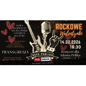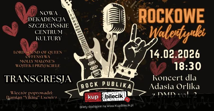 bilety: "Rock Publika Dla Orlika" - event charytatywny na rzecz Adasia Orlika. Na scenie Nowej Dekadencji w Szczecinie wystąpią: Przygotowaliśmy dla Was dwa rodzaje biletów/cegiełek: Transgresja artyści: Paweł Gładysz Gładky, Mateusz Kołodziejczyk Komin, Marcin Bula Bulion i inniTRANSGRESJA to Śląsko-dąbrowski zespół, który swoimi kompozycjami wciąga w świat energetyzującego psychodelicznego rocka. Tajemniczej i mrocznej, a przy tym melodyjnej muzyce towarzyszą tu niesztampowe lirycznie teksty. Bilety do nabycia na: KupBilecik.pl |