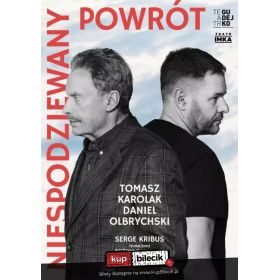 bilety: W Niespodziewanym powrocie Daniel Olbrychski wciela się w postać aktora, który ma zagrać króla Leara. Szczególna trema i wielkie nadzieje związane z podjęciem tak dużego aktorskiego wyzwania nie są Olbrychskiemu obce. W końcu sam mierzył się z nimi, kiedy grał główne role w spektaklach Szekspira. Tłem dla aktorskich rozterek są skomplikowane relacje rodzinne - kłopoty z partnerami, rodzicami i dziećmi, które niezwykle bawią, jeśli tylko nas nie dotyczą! Ważną postacią jest zwłaszcza syn głównego bohatera - w tej roli doskonale znany publiczności z wielu produkcji telewizyjnych i kinowych Tomasz Karolak. Aktor o dużym talencie komediowym z wejściem w postać też nie będzie miał problemu - w końcu synem jest od urodzenia! Niespodziewany Powrót artyści: Tomasz Karolak, Daniel Olbrychski„Niespodziewany powrót” to sztuka, za którą autor otrzymał wiele prestiżowych francuskich nagród, a wiadomo, że gdzie jak gdzie, ale w ojczyźnie Moliera na komedii się znają! W „Niespodziewanym powrocie” przeplatają się wątki rodzinne – a czy jest coś bardziej zabawnego niż kłopoty z partnerami, rodzicami i dziećmi, które przydarzają się innym – z rozterkami szekspirowskiego Króla Leara, a te z kolei, z tremą i nadziejami aktora, który tegoż Leara ma zagrać w Teatrze Narodowym. Bilety do nabycia na: KupBilecik.pl |